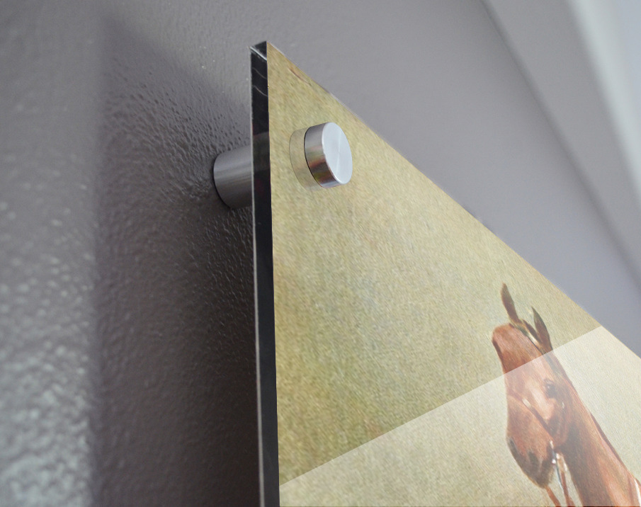 Printed to the edge - Ready to hang - provided with 4 premium polished aluminum stand off ( wall screws and mounting hardware provided ) We suggest a thicker 3/16" acrylic for any size over 42 inches to guarantee a straight acrylic, without curvature