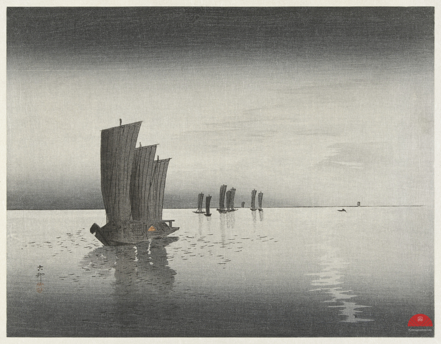 Fishing boats at dusk 1900-1920 by Ohara Koson 1877-1945.