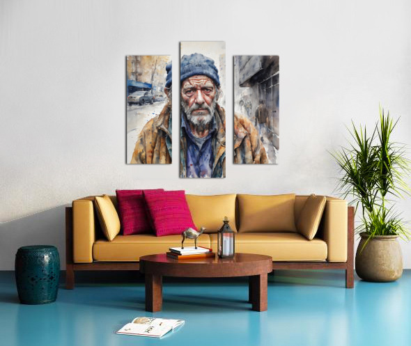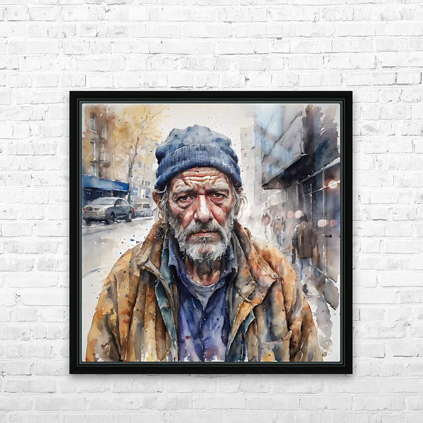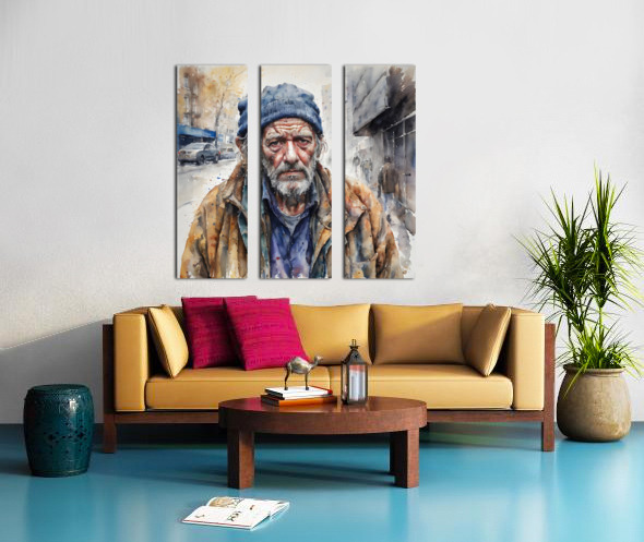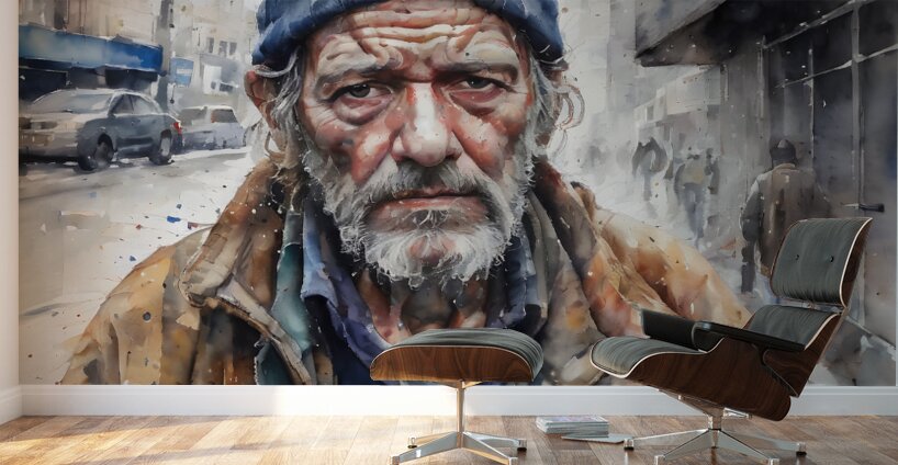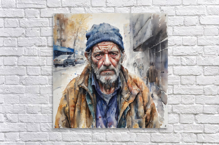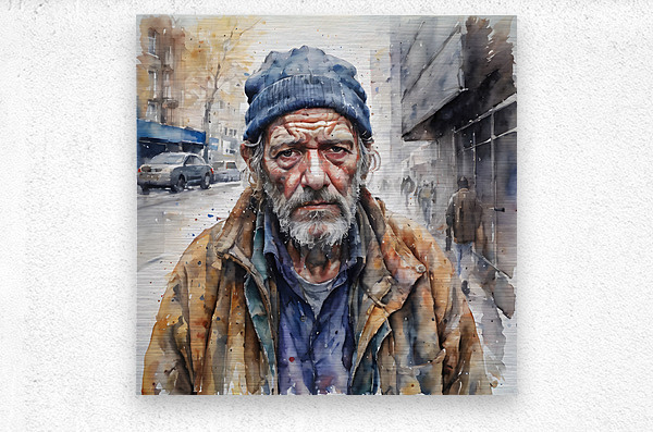 Watercolor of a 50 year old man who is homeless and cold and in his eyes you can see pain from years of loss and desperation. "What's Left" By Bru...[+]