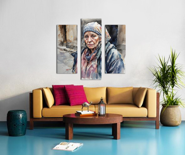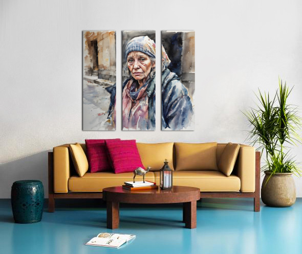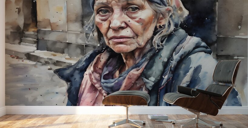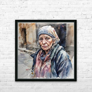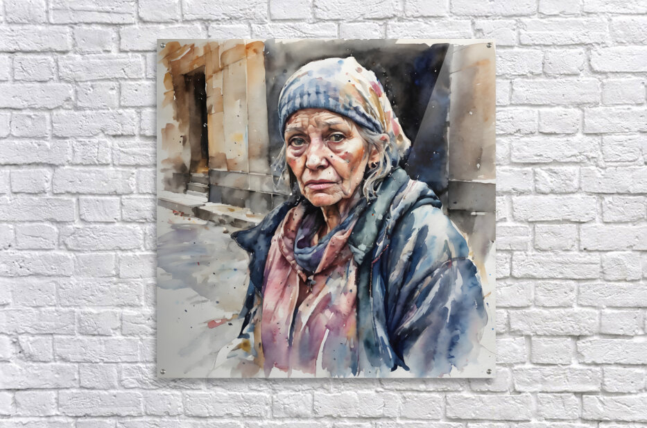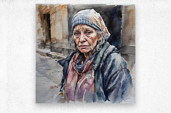 Watercolor of a 50 year old woman who is homeless and cold and in his eyes you can see pain from years of loss and desperation. “I'm Truly Tired” By Bruce Lazarus