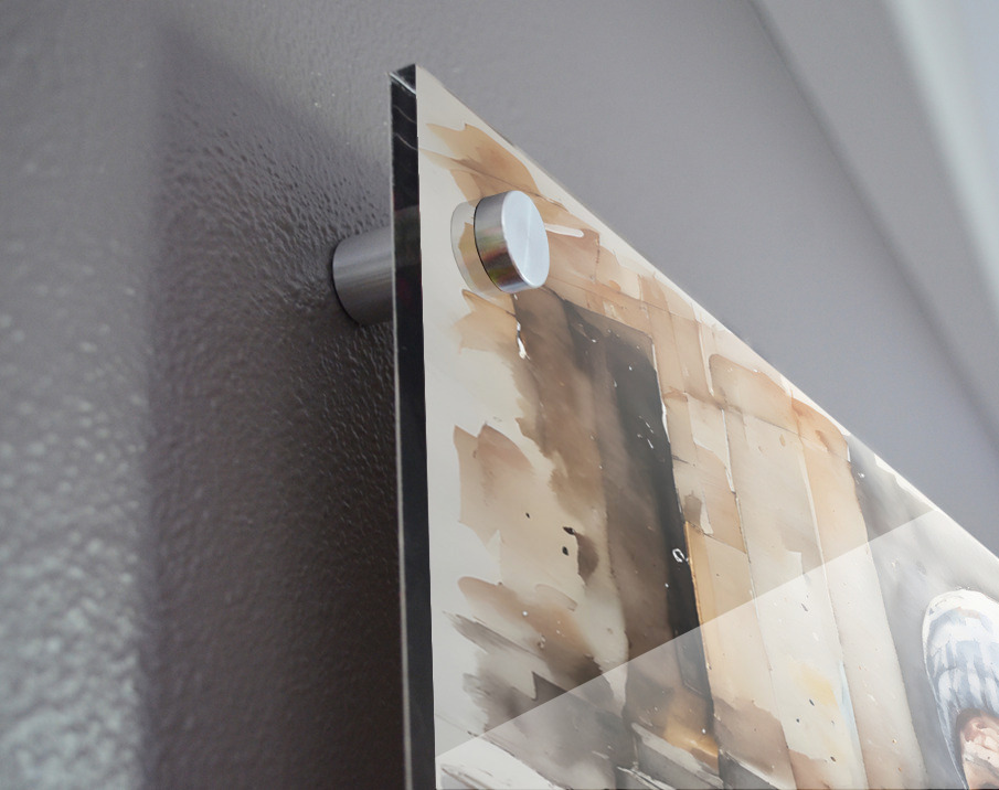 Printed to the edge - Ready to hang - provided with 4 premium polished aluminum stand off ( wall screws and mounting hardware provided ) We suggest a thicker 3/16" acrylic for any size over 42 inches to guarantee a straight acrylic, without curvature