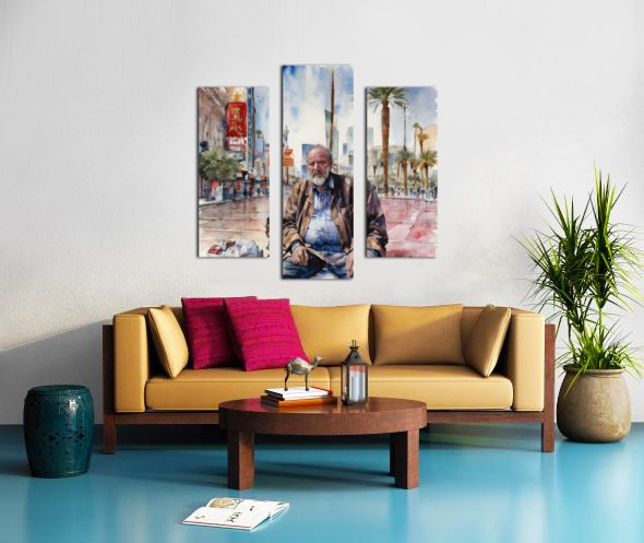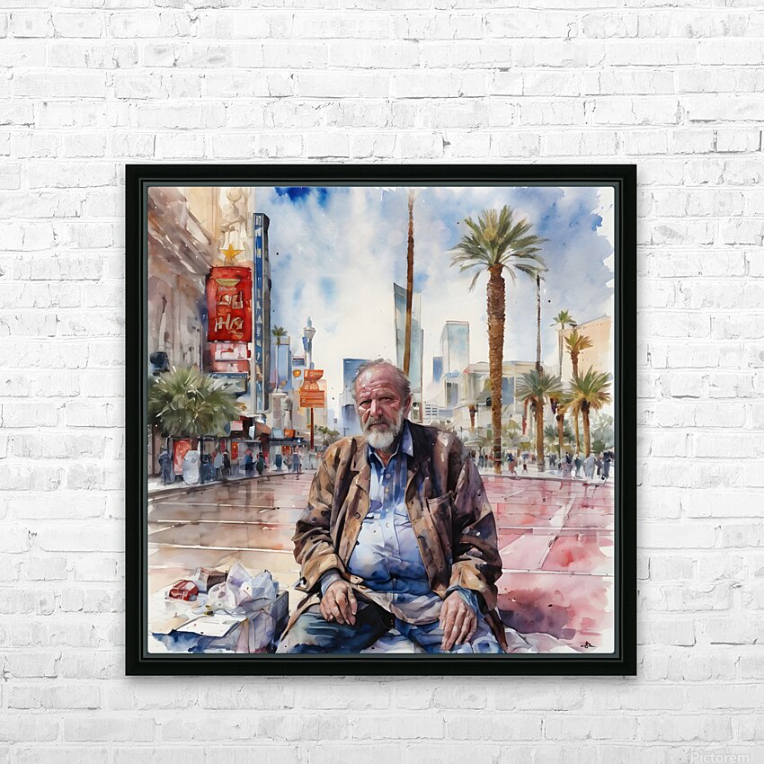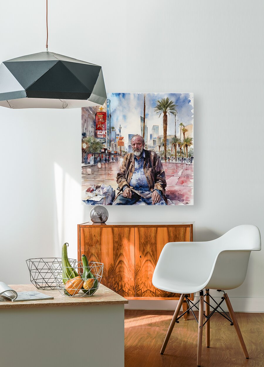 Man who is a gambler that has fallen on hard times his face reflecting years of disappointment as he stands on the Las Vegas Strip surrounded by opulence that contrasts with his own desolation. “Decisions Decisions Decisions” By Bruce Lazarus
