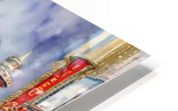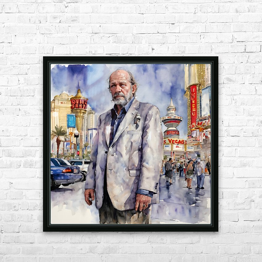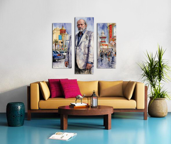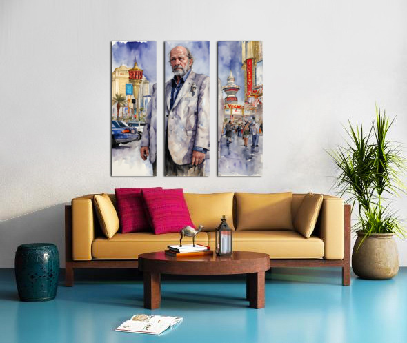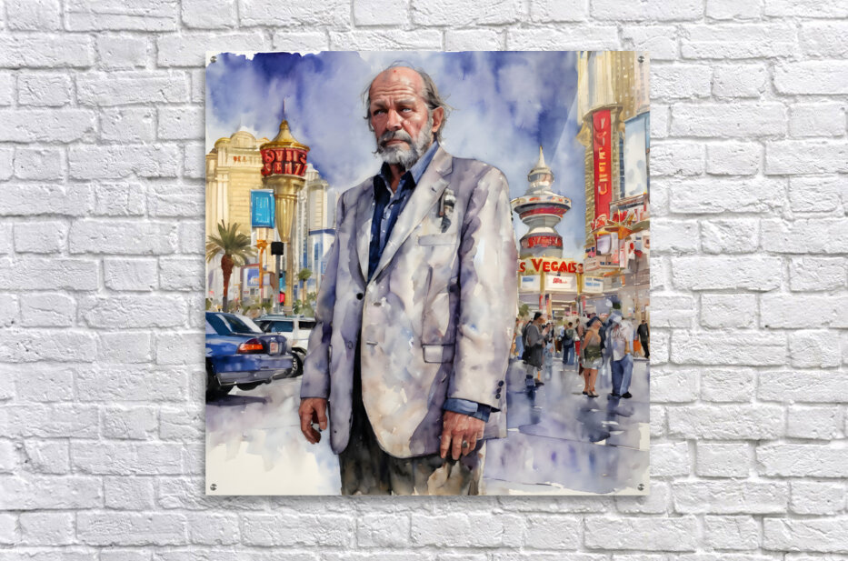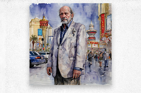 Watercolor of a 50-year-old man who is a homeless gambler and has fallen on hard times his face reflecting years of disappointment and regret as he stands on the Las Vegas Strip surrounded by opulence that contrasts with his own desolation. “Broke” By Bruce Lazarus
