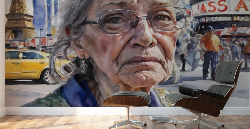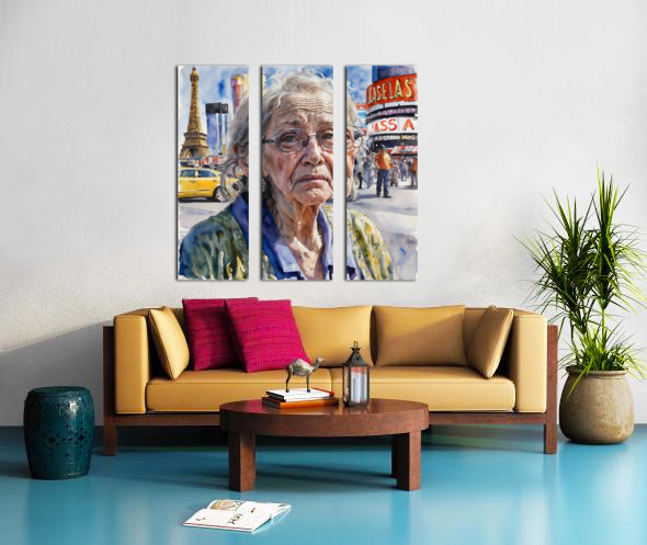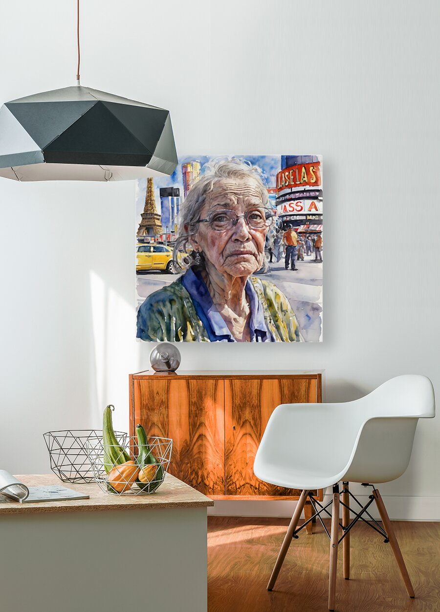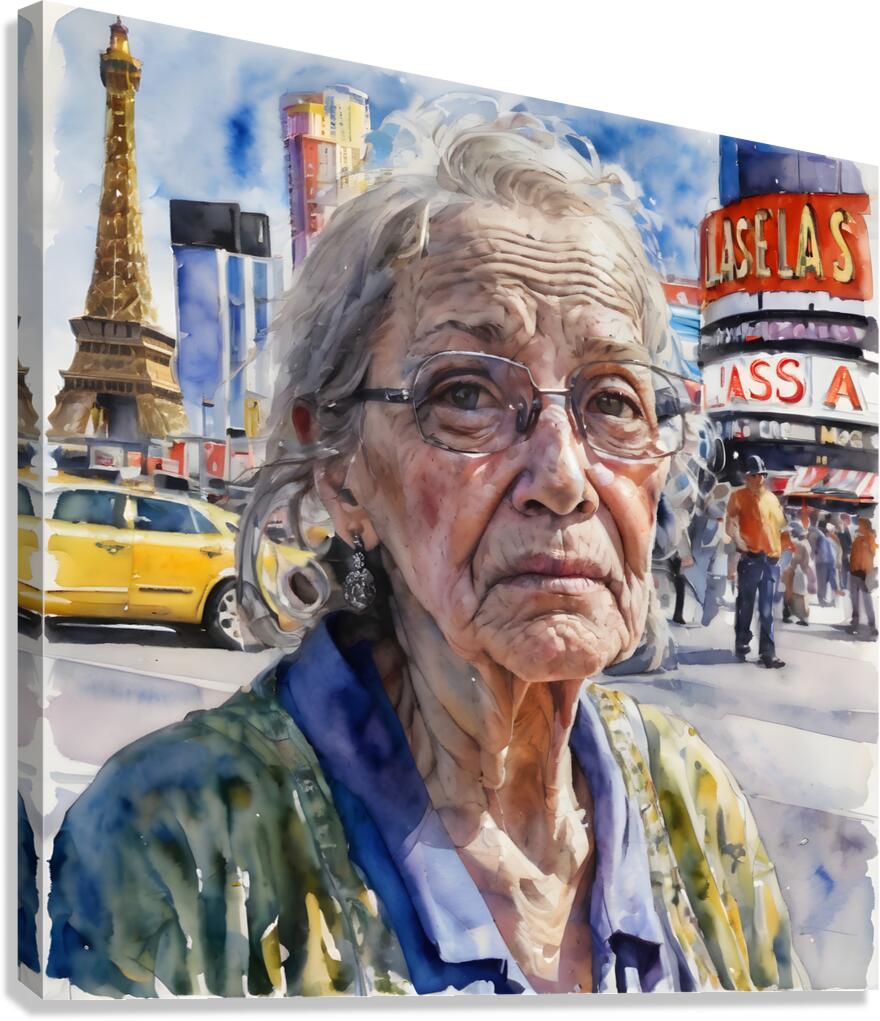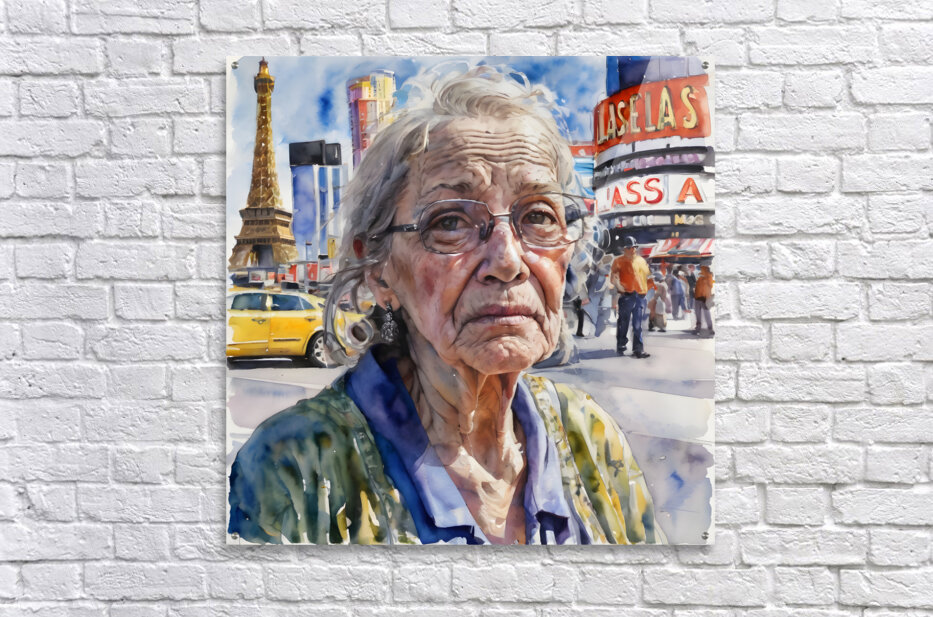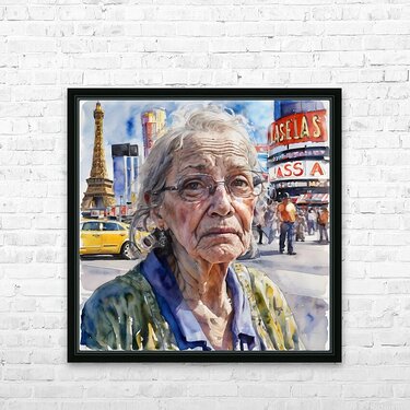 Watercolor of a 70-year-old woman who is a homeless gambler and has fallen on hard times, her face reflecting years of disappointment and regret as she stands on the Las Vegas Strip, surrounded by opulence that contrasts with her own desolation. “Only Me” By Bruce Lazarus