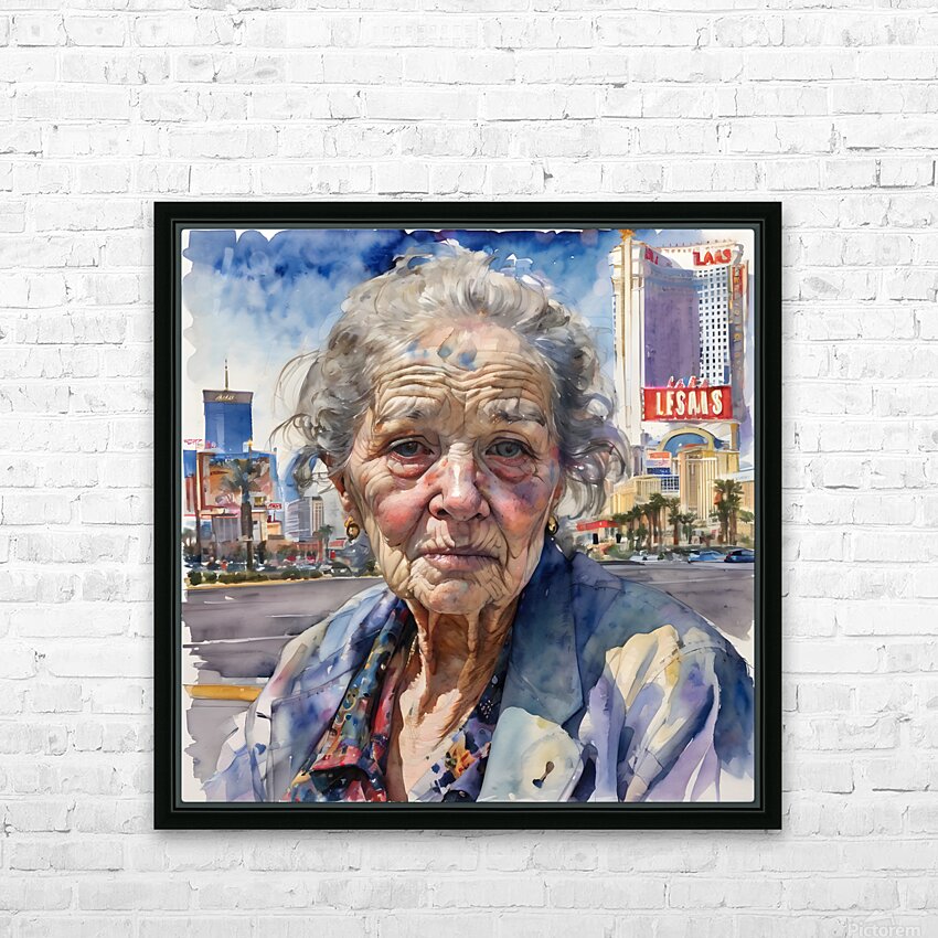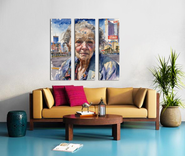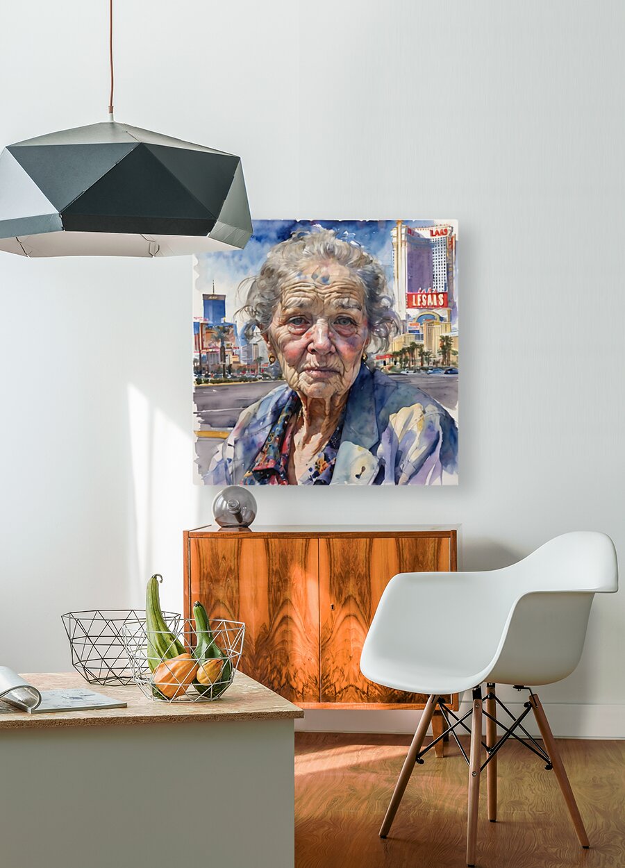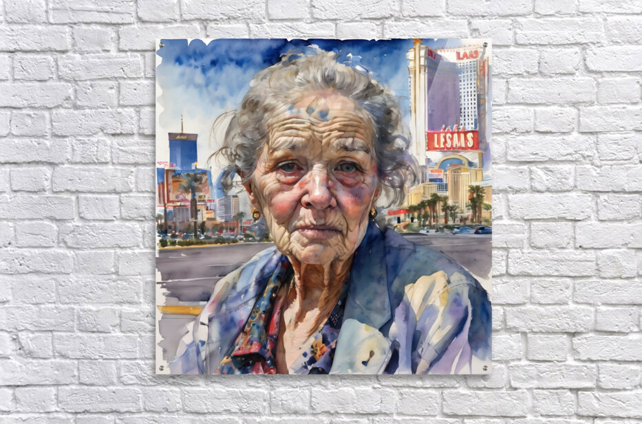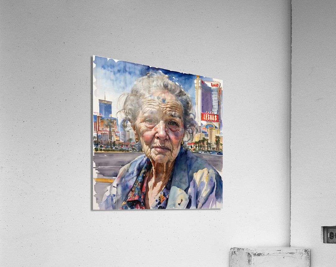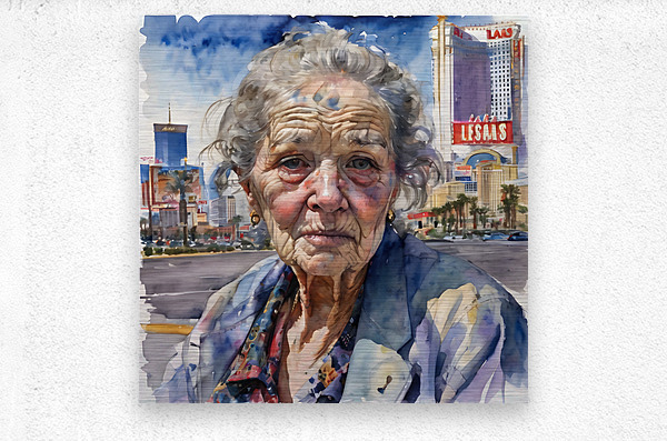 Watercolor of a 70-year-old woman who is a homeless gambler and has fallen on hard times, her face reflecting years of disappointment and regret as she stands on the Las Vegas Strip, surrounded by opulence that contrasts with her own desolation. “All Gone” By Bruce Lazarus
