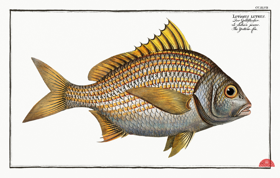 Yellow-fin Lutianus luteus from Ichtylogie ou Histoire naturelle: génerale et particuliére des poissons 1785-1797 by Marcus Eliser 1723-1799