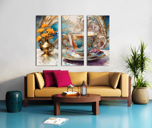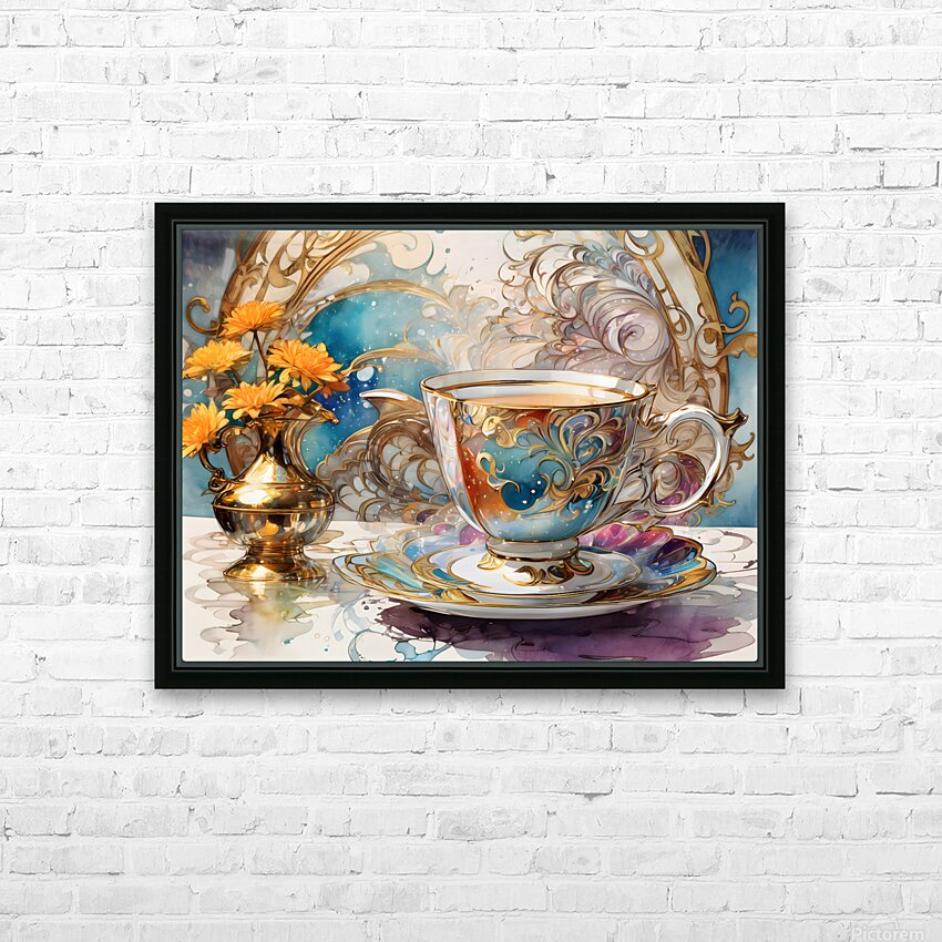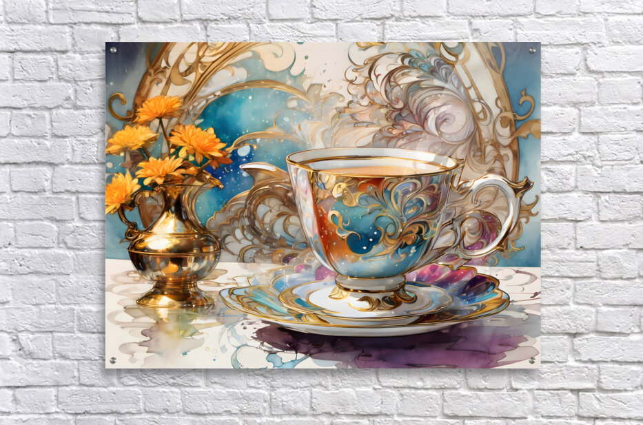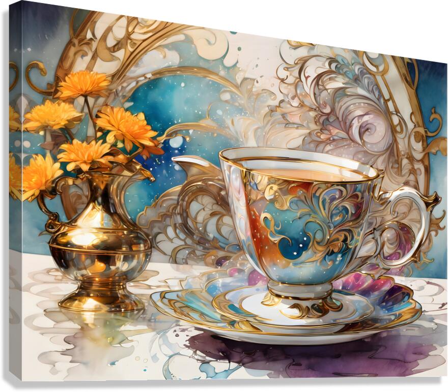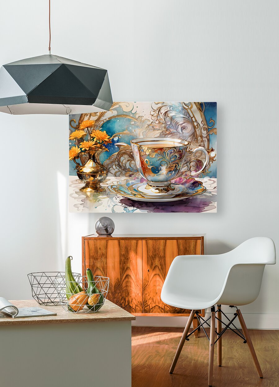 A (((dainty table))) set with a (((extreme closeup steaming hot tea))) in a ((tiny, delicate colorful fine china teacup)) against a backdrop of ((Artg...[+]