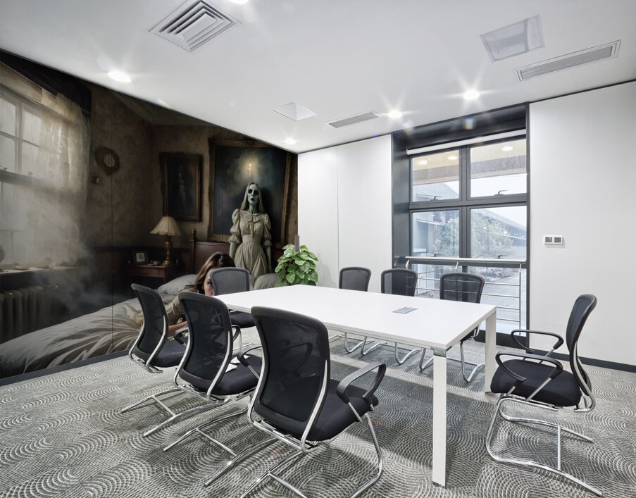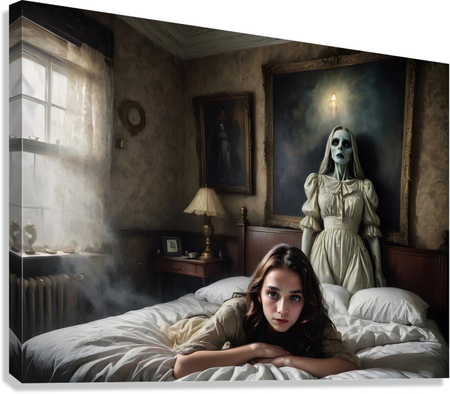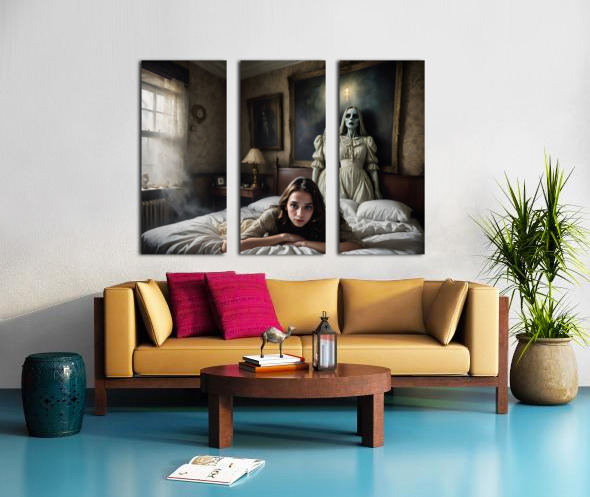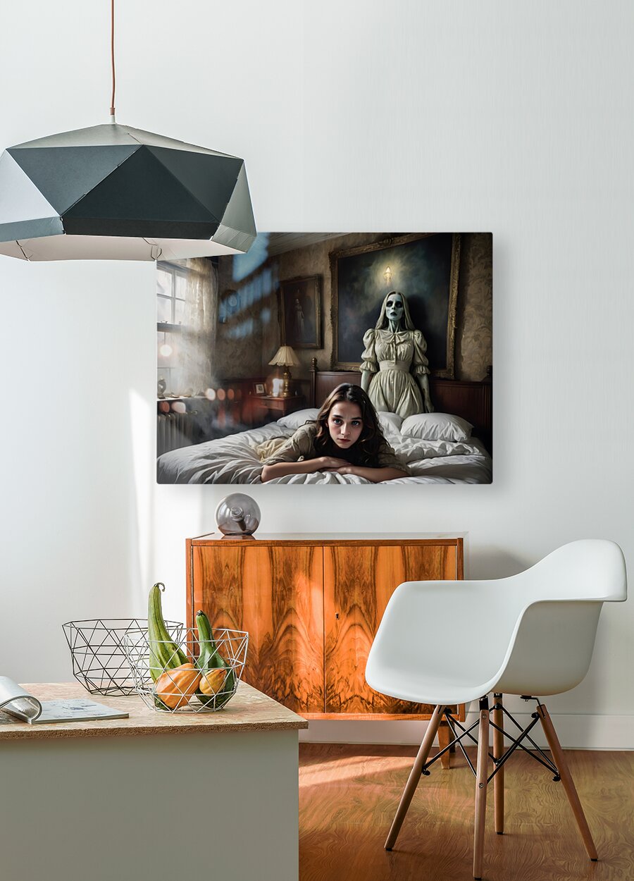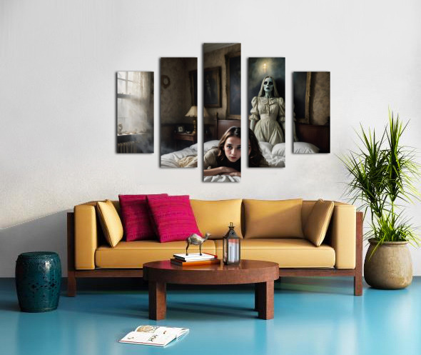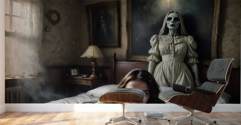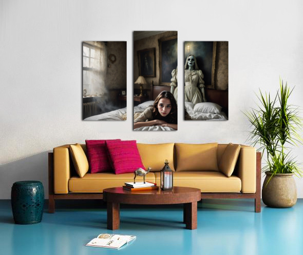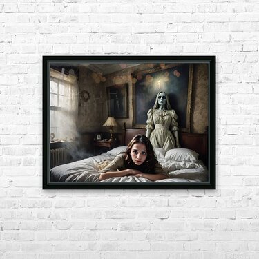 A scene in a creepy mansion from a Hitchcock movie, unusual, composition with something very near and something very far, filmic, film grain, scared woman (well defined face) lying in a bed, attacked by (ghostly painting on the wall, trying to grab her) and (illusionary mist), super creepy and evil shadows, CinemaScope lens, hyper realistic, hyper details 16k, every pixel tells a story, grainy film, (((ultra detailed faces!))) (((intricate details around the eyes))), archaic colors, surprising interpolations, unseen scary stuff, award winning creation, illusion of fear, dark, horror, unreal fear, sense of something horrible going to happens within seconds, a translucent ghost is hovering above the ground, a creepy statue, all bone-chilling (Copyright ISHISH 2024 All rights Reserved)