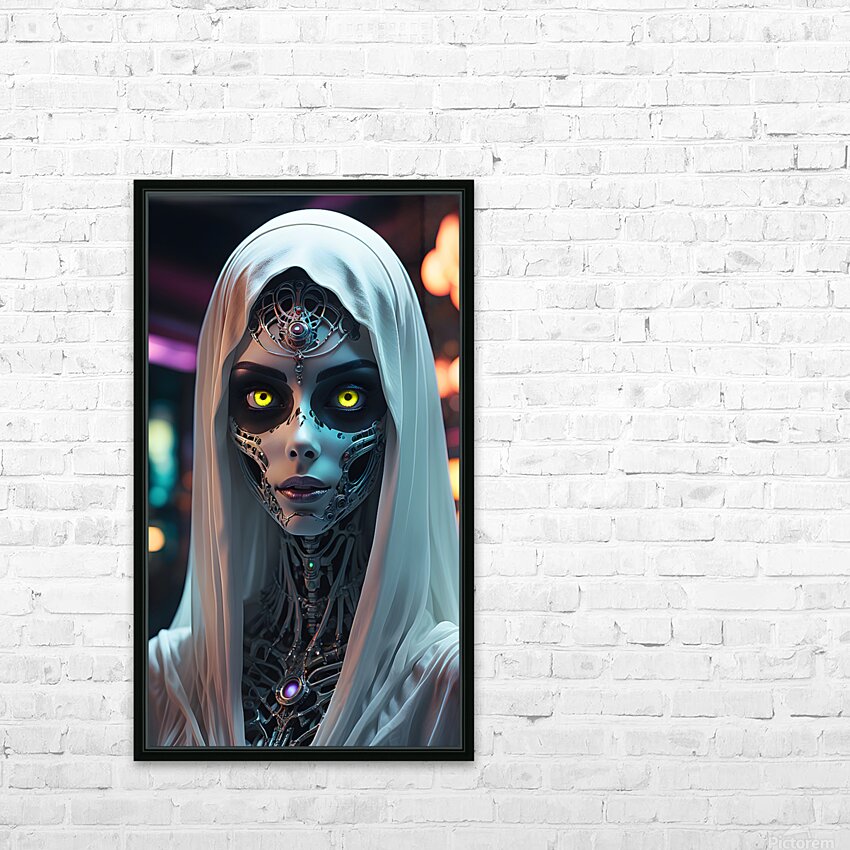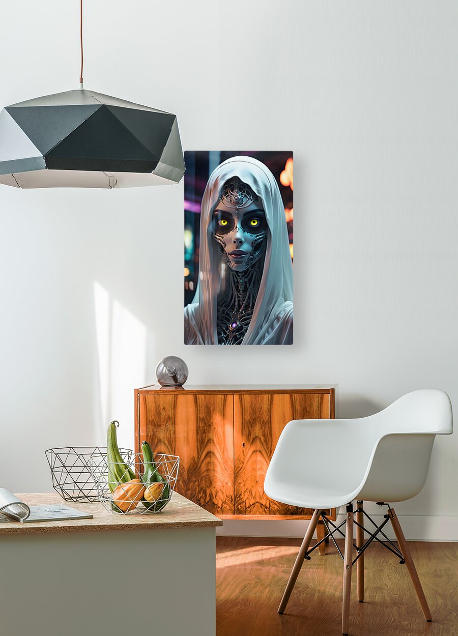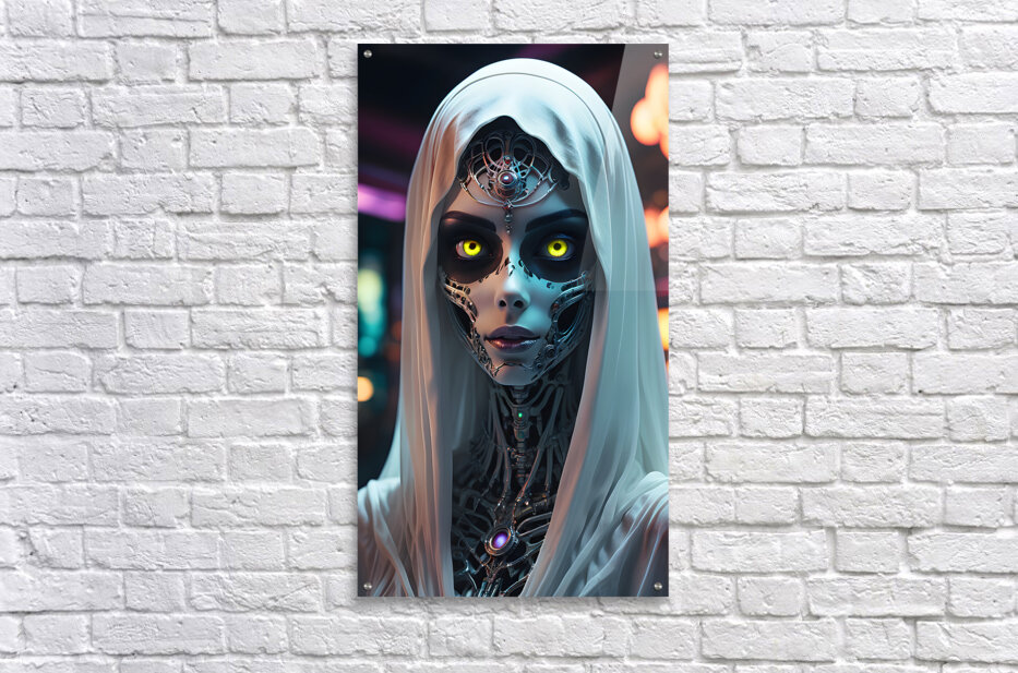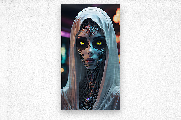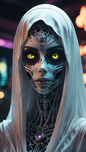 A beautiful cyberpunk Hitchcock style(((evil ghost))) white-painted titanium-made veiled Arab skeleton nymph’s glowing eyes are actually black holes, the minimal Sci-Fi neony decorations form the eyelids and lashes, symbolizing the way we see the world through the lens of nature’s beauty. (Copyright ISHISH 2024 All rights Reserved)