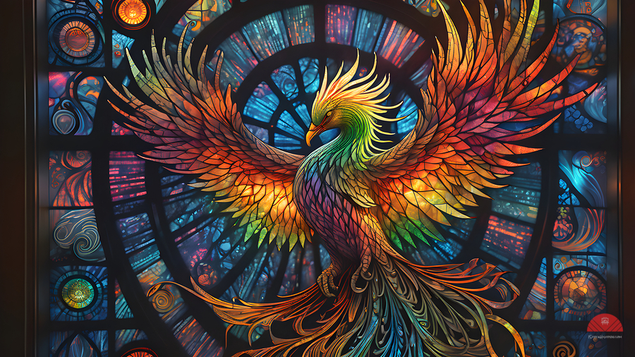 A STAINED GLASS CRYSTALLINE RAINBOW PHOENIX BY ISHISH