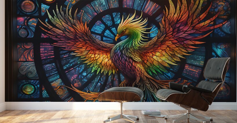 ABOUT THIS ARTWORK: A STAINED GLASS CRYSTALLINE RAINBOW PHOENIX BY ISHISH