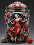 Storing your dreams in a jar. In the style of David MacDowell, Bernardo Strozzi and Greg Simkins. Deep colours with reds and silver. Intricate fabric designs. (Copyright ISHISH 2024 All rights Reserved)