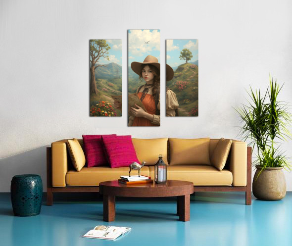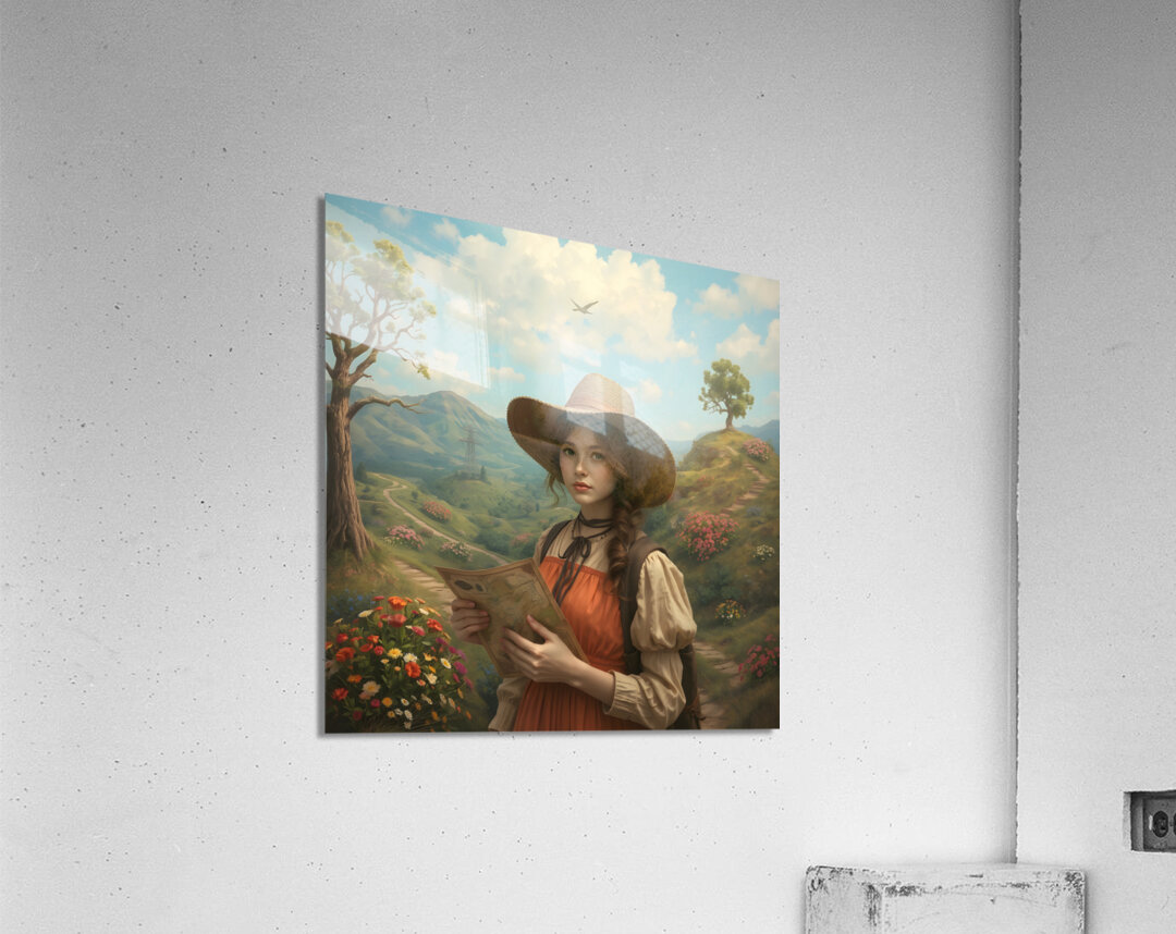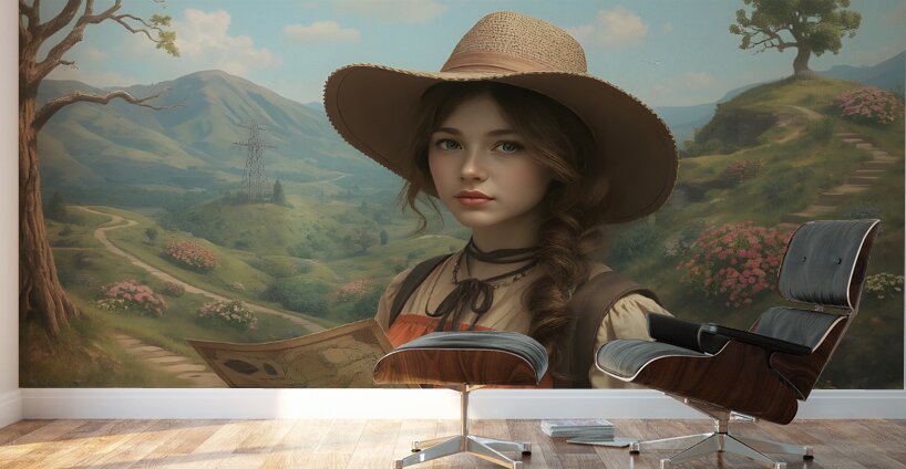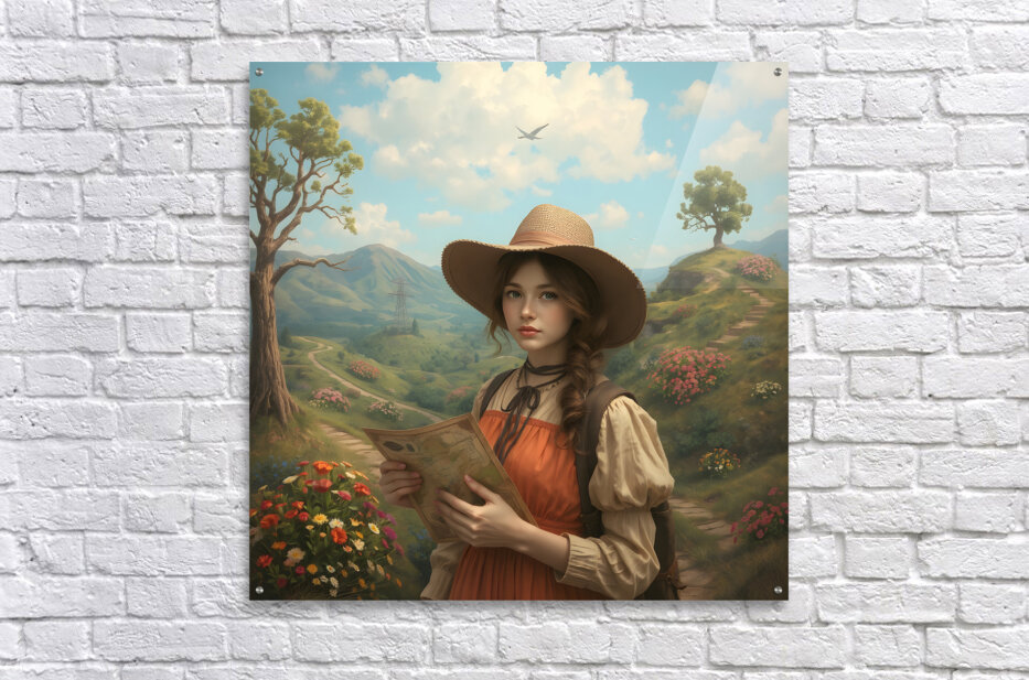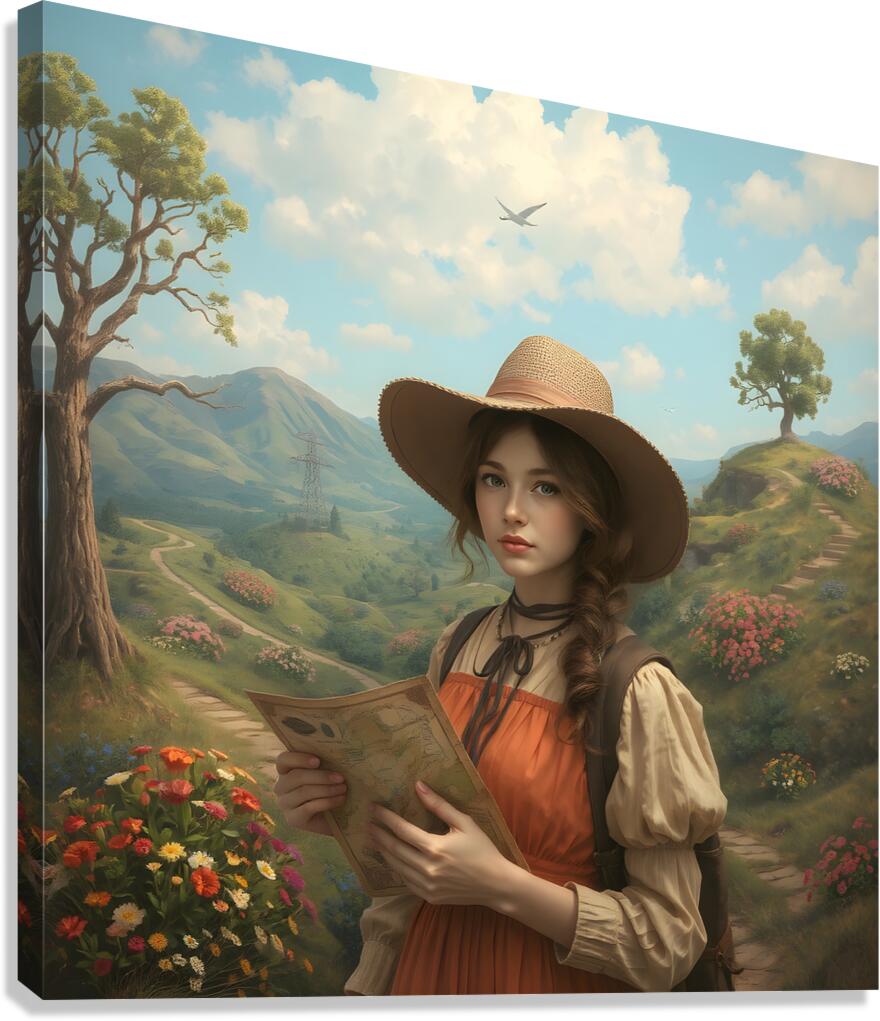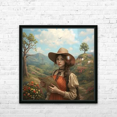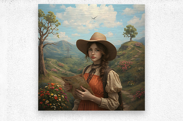 A ((( traveler))) from an ((antique land)) where the landscape exudes timeless charm, painted in a ((style that combines realism with a touch of whimsy)). The scene features ((intricate details of winding paths, adorned with colorful flowers and the occasional tree that stands out against the backdrop of the clear blue sky. Colors tend to be warm and inviting. The traveler's attire is in line with the rustic theme, with a ((vintage-inspired dress and hat)), and he or she is posed with a ((a map in hand)), making it clear they are on the road to discovery. The traveler's face has a serene expression and is framed by a ((simple yet elegant hairstyle) that complements the overall style of the painting(Copyright ISHISH 2025 All rights Reserved)