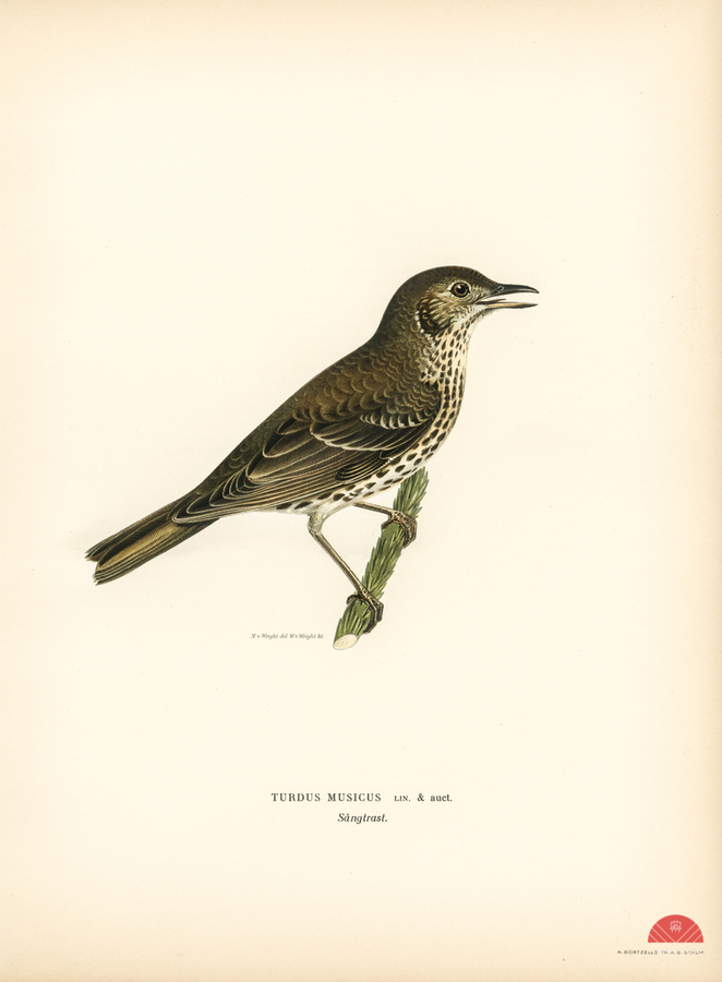 Redwing-Song thrush Turdus usicus illustrated by Magnus von Wright 1905-1968. from 1929 folio version of Svenska Fåglar Efter Naturen Och Pa Sten Ritade.