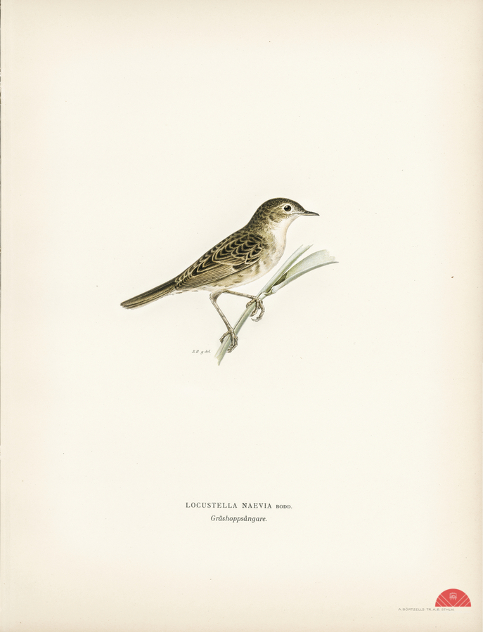 Locustella naevia illustrated by Magnus von Wright 1905-1968. from 1929 folio version of Svenska Fåglar Efter Naturen Och Pa Sten Ritade.