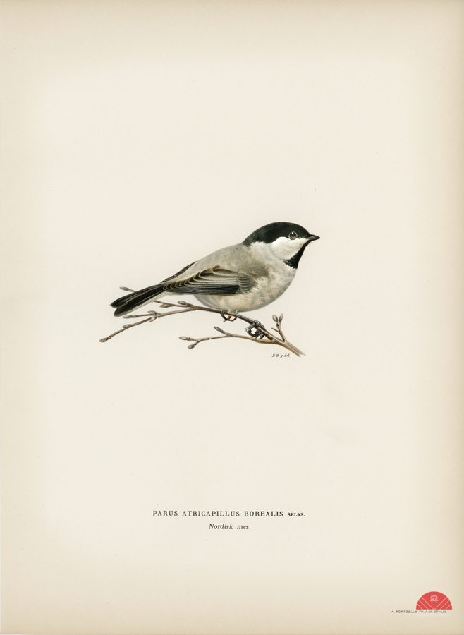 Black-capped chickadee Parus atricapillus illustrated by Magnus von Wright 1905-1968. from 1929 folio version of Svenska Fåglar Efter Naturen Och Pa Sten Ritade.