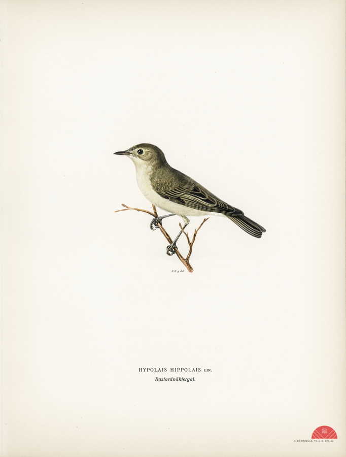 Tree warbler Hypolais hipolais illustrated by Magnus von Wright 1905-1968. from 1929 folio version of Svenska Fåglar Efter Naturen Och Pa Sten Ritade...[+]
