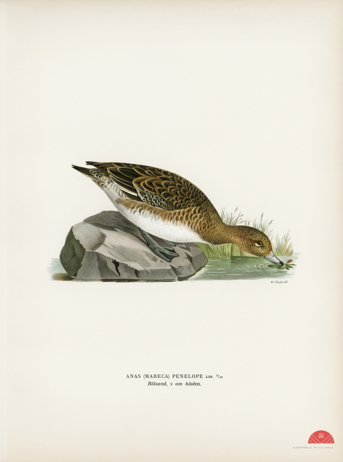 Eurasian wigeon female Anasmereca penelope illustrated by Magnus von Wright 1905-1968. from 1929 folio version of Svenska Fåglar Efter Naturen Och Pa Sten Ritade.
