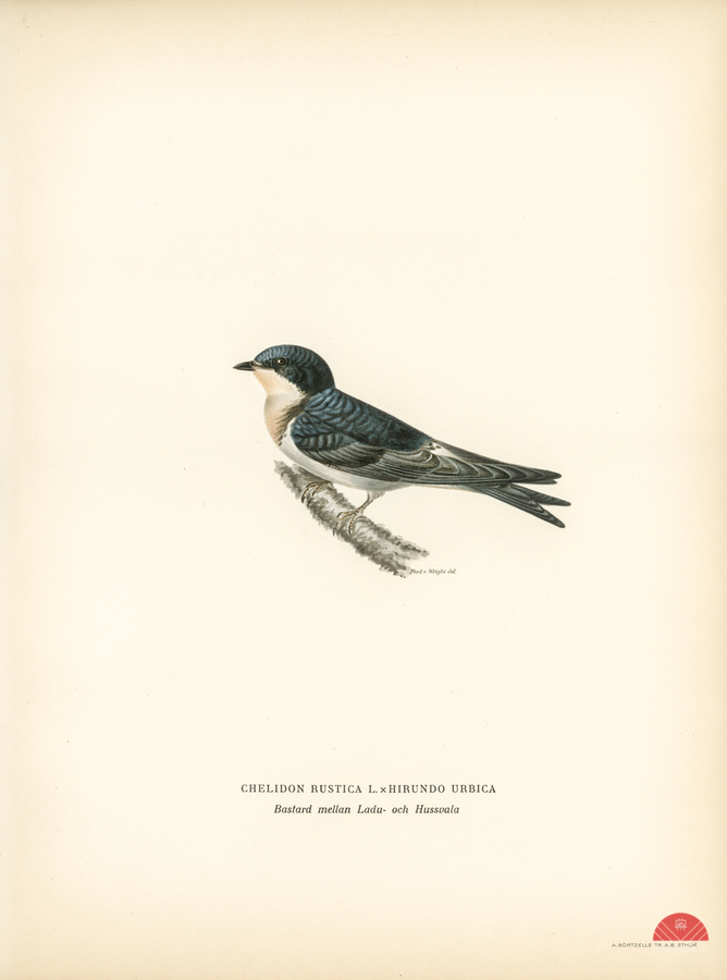 Hybrid between common house-martin and barn swallow Chelidon rustica L.xHirundo urbica illustrated by Magnus von Wright 1905-1968. from 1929 folio version of Svenska Fåglar Efter Naturen Och Pa Sten Ritade.