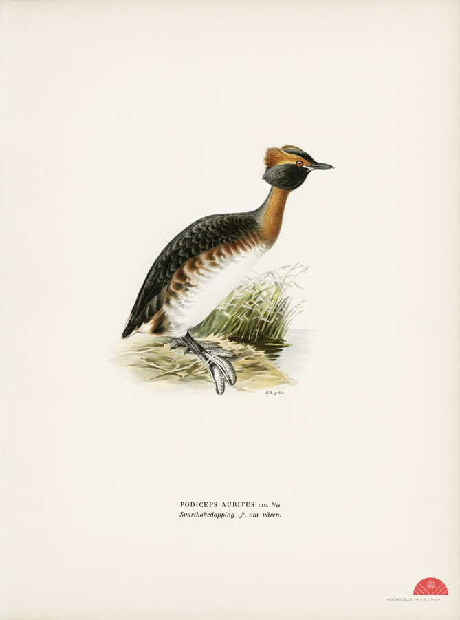 Horned grebe-in spring Podiceps auritus illustrated by Magnus von Wright 1905-1968. from 1929 folio version of Svenska Fåglar Efter Naturen Och Pa Sten Ritade.