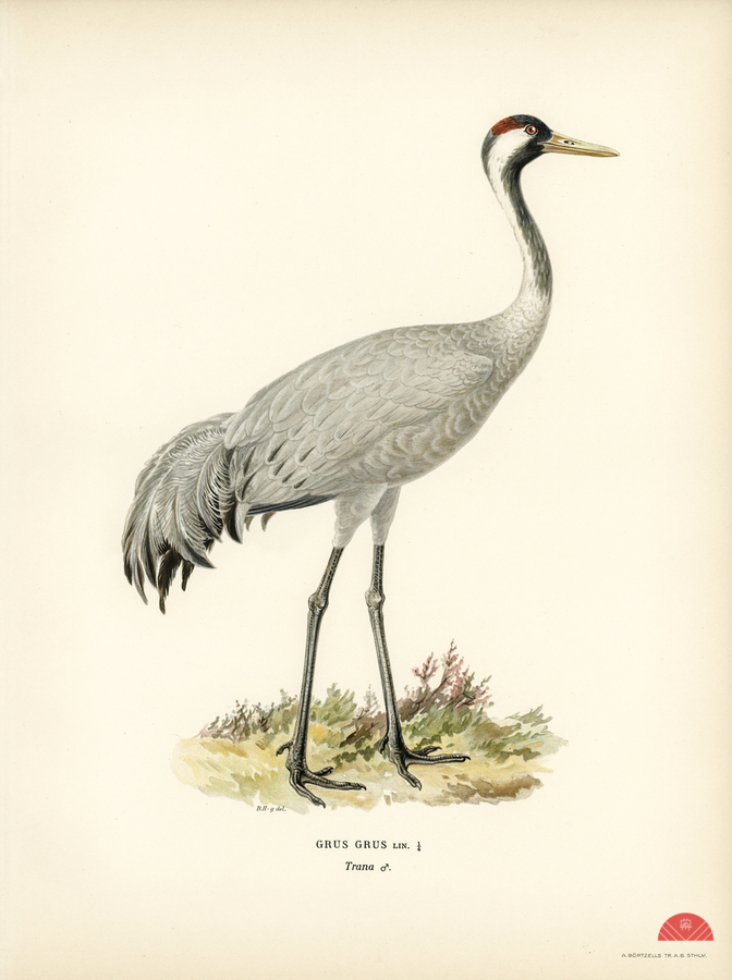 Common Crane Grus Grus illustrated by Magnus von Wright 1905-1968. from 1929 folio version of Svenska Fåglar Efter Naturen Och Pa Sten Ritade.