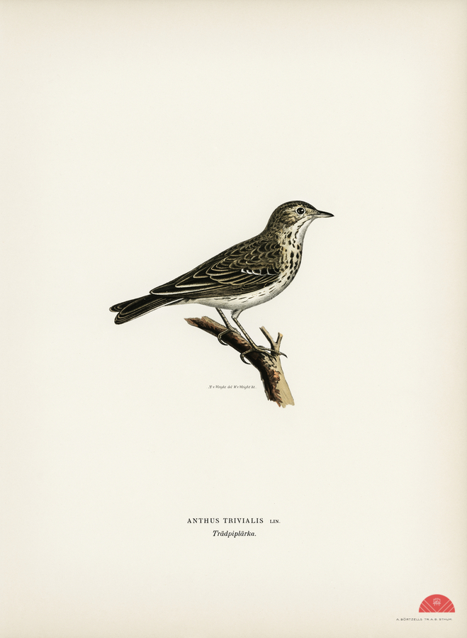 Tree pipit Anthus trivialis illustrated by Magnus von Wright 1905-1968. from 1929 folio version of Svenska Fåglar Efter Naturen Och Pa Sten Ritade.