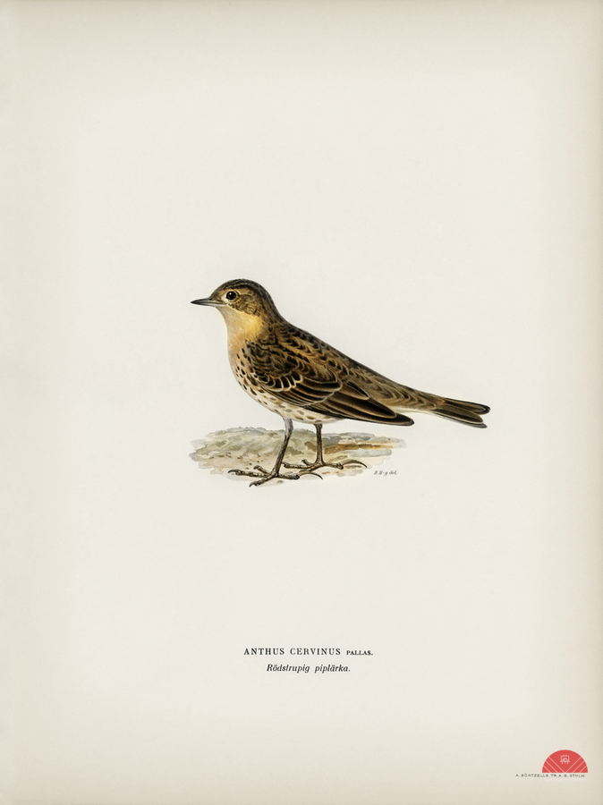 Red-throated pipit Anthus cervinus bird illustrated by Magnus von Wright 1905-1968. from 1929 folio version of Svenska Fåglar Efter Naturen Och Pa St...[+]