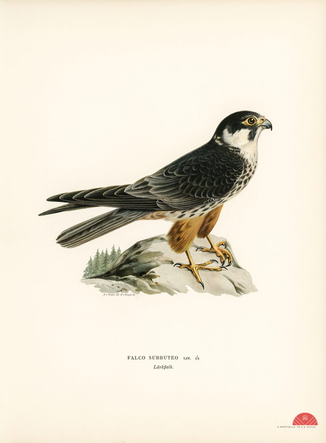 Eurasian Hobby Falco subbuteo illustrated by Magnus von Wright 1905-1968. from 1929 folio version of Svenska Fåglar Efter Naturen Och Pa Sten Ritade.