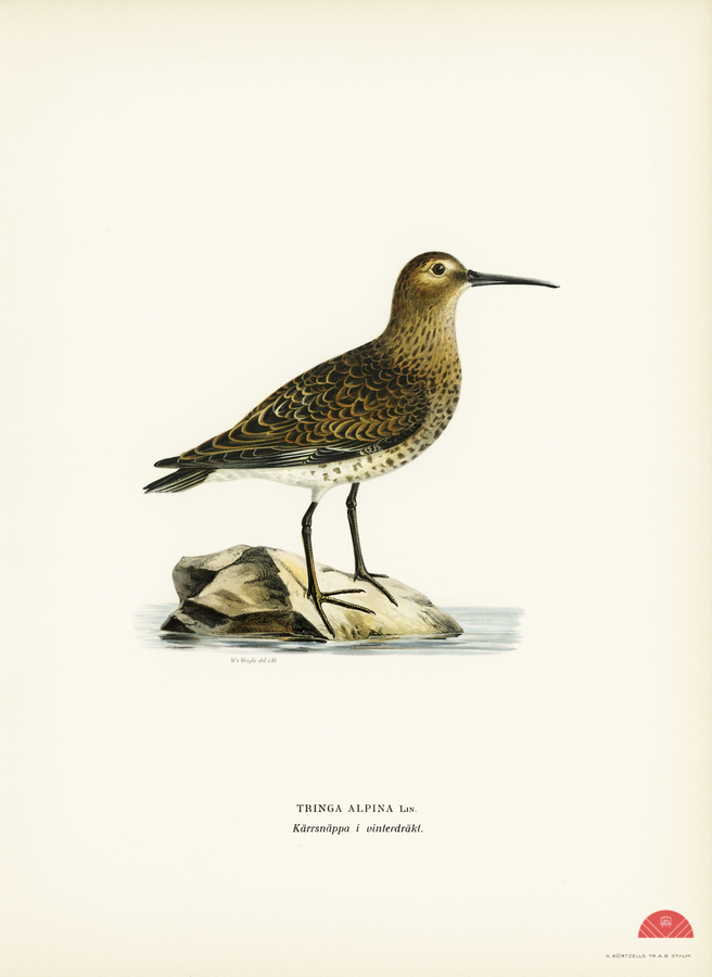 Dunlin Tringa Alpina illustrated by Magnus von Wright 1905-1968. from 1929 folio version of Svenska Fåglar Efter Naturen Och Pa Sten Ritade.