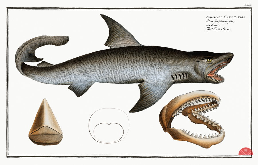 White Shark Squalus Carcharias from Ichtylogie ou Histoire naturelle: génerale et particuliére des poissons 1785-1797 by Marcus Eliser 1723-1799