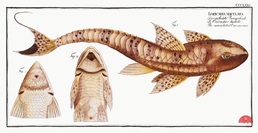 Maculated Cuirassier Loricaria maculata from Ichtylogie ou Histoire naturelle: génerale et particuliére des poissons 1785-1797 by Marcus Eliser 1723...[+]