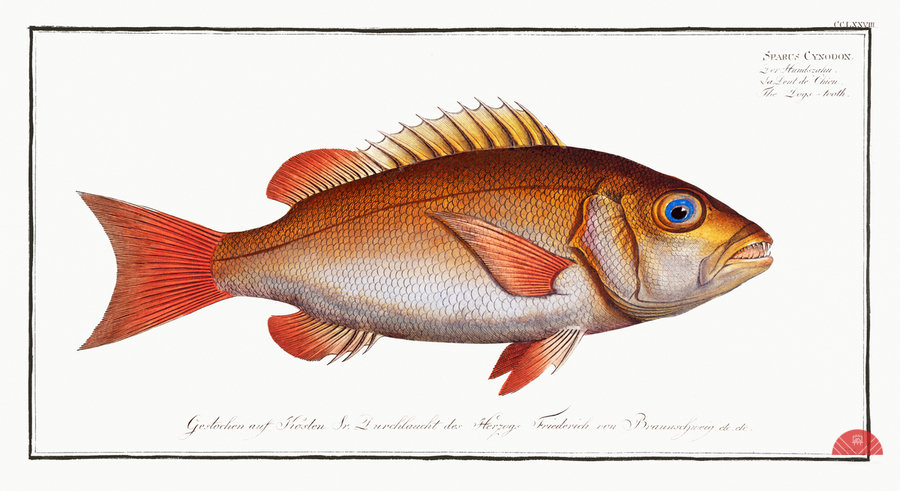 Dogs-tooth Sparus Cynodon from Ichtylogie ou Histoire naturelle: génerale et particuliére des poissons 1785-1797 by Marcus Eliser 1723-1799