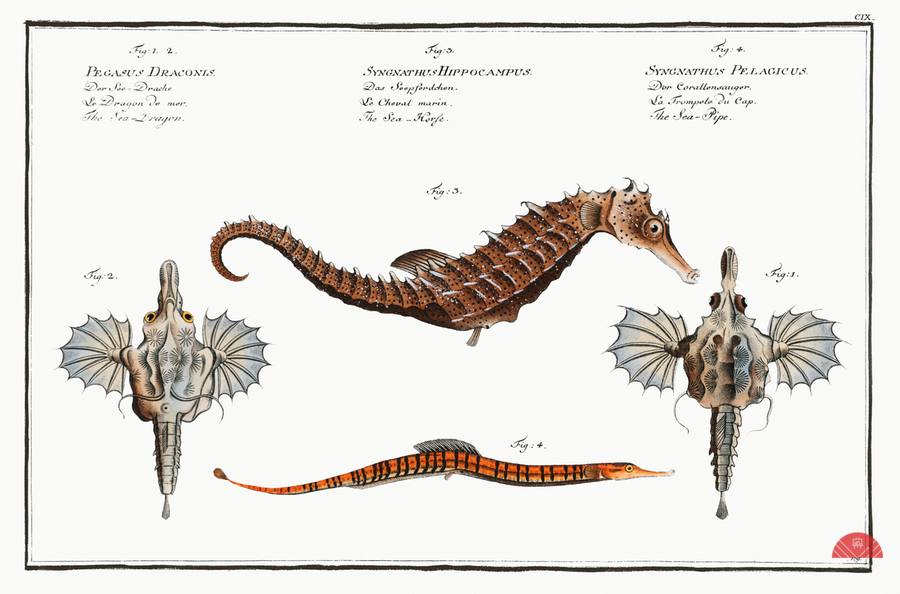 1. 2. Sea Dragon Pegasus Draconis 3. Sea-Horse Syngnathus Hippocampus 4. Sea-Pipe Syngnathus Pelagicus from Ichtylogie ou Histoire naturelle: génerale et particuliére des poissons 1785-1797 by Marcus Eliser 1723-1799
