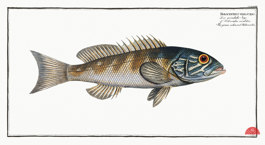 Green coloured Holocentre Holocentrus verescens from Ichtylogie ou Histoire naturelle: génerale et particuliére des poissons 1785-1797 by Marcus Eli...[+]