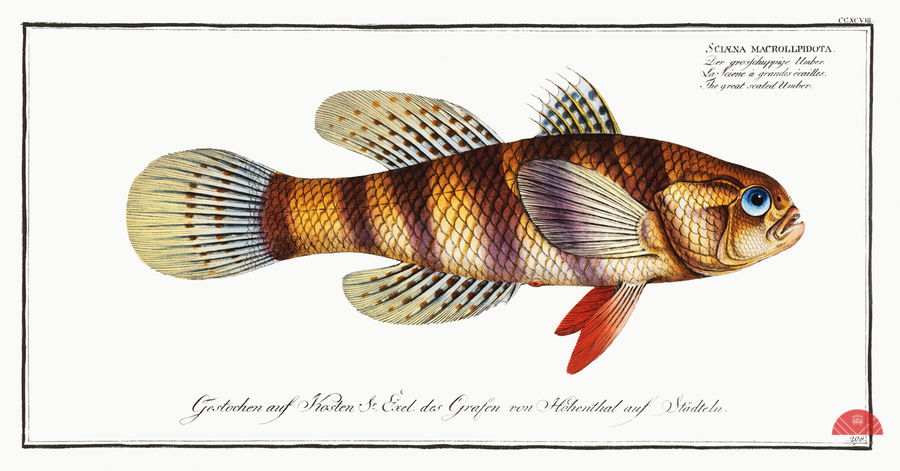Great-scaled Umber Sciaena macrollpidota from Ichtylogie ou Histoire naturelle: génerale et particuliére des poissons 1785-1797 by Marcus Eliser 172...[+]