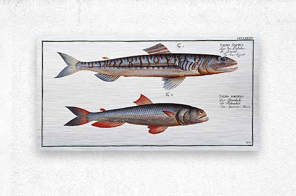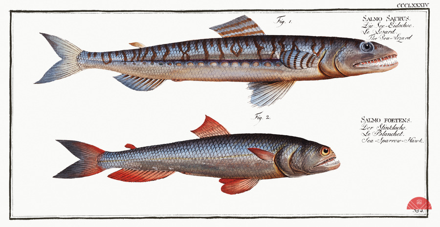 1. Sea-Lizard Salmo Saurus 2. Sea-Sparrow-Hawk Salmo foetens from Ichtylogie ou Histoire naturelle: génerale et particuliére des poissons 1785-1797 by Marcus Eliser 1723-1799