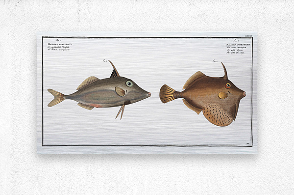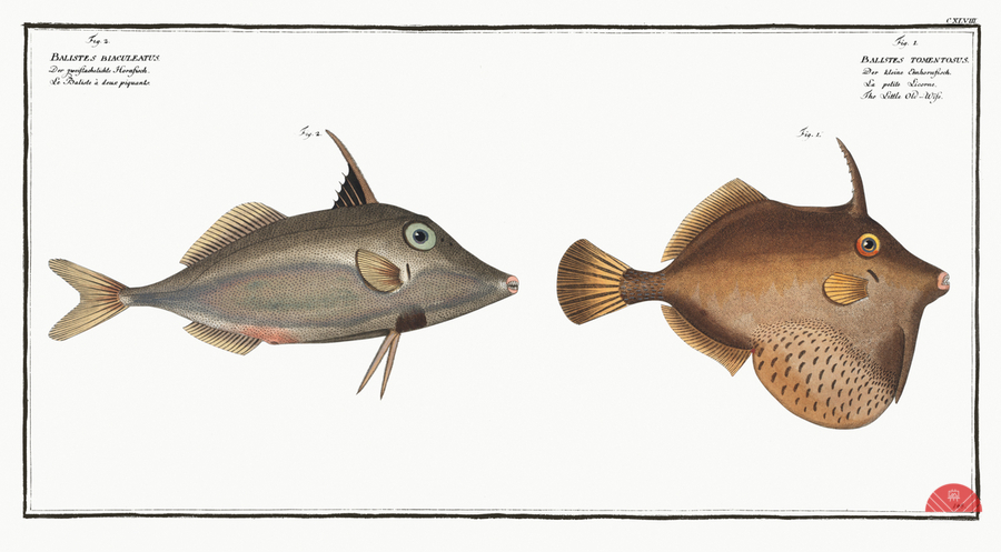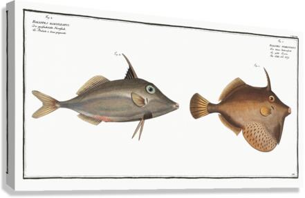 1. Little Old-Wife Balistes Tomentosus 2. Short-nosed tripod fish Balistes biaculeatus from Ichtylogie ou Histoire naturelle: génerale et particuliére des poissons 1785-1797 by Marcus Eliser 1723-1799