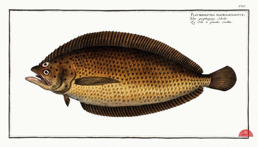Pleuronectes macrolepidotus from Ichtylogie ou Histoire naturelle: génerale et particuliére des poissons 1785-1797 by Marcus Eliser 1723-1799