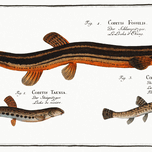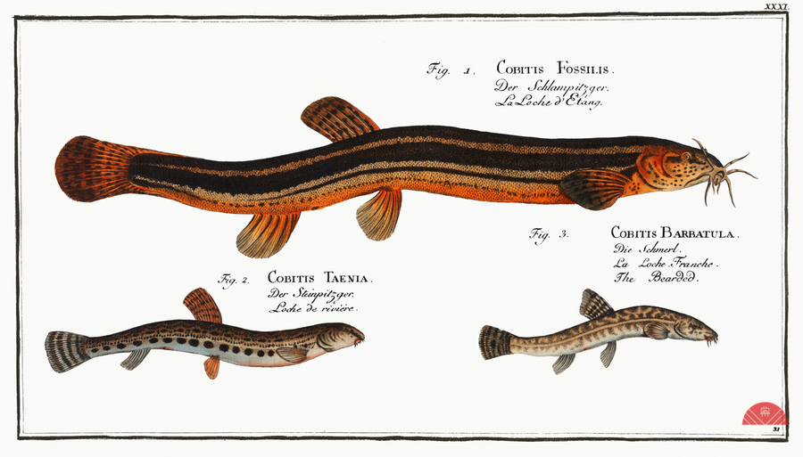 ABOUT THIS ARTWORK: 1. MUDDY-LOACH COBITIS FOSSILIS 2. RIBBAN-LOACH COBITIS TAENIA 3. BEARDED-LOACH COBITIS BARTULA