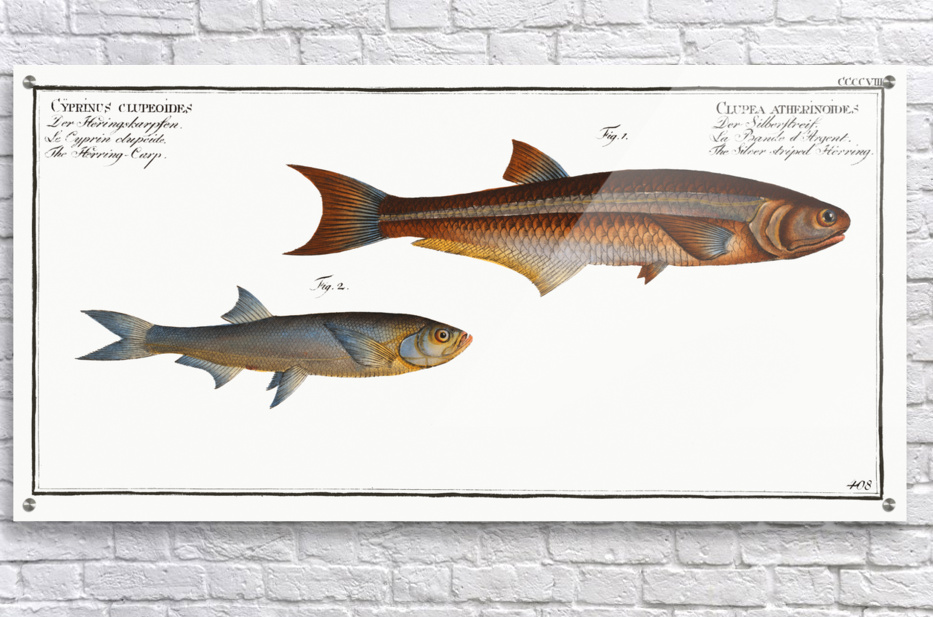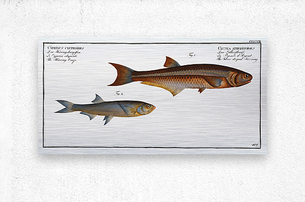 1. Silver-striped Herring Clupea atherinoides 2. Herring-Carp Cyprinus clupeoides from Ichtylogie ou Histoire naturelle: génerale et particuliére des poissons 1785-1797 by Marcus Eliser 1723-1799