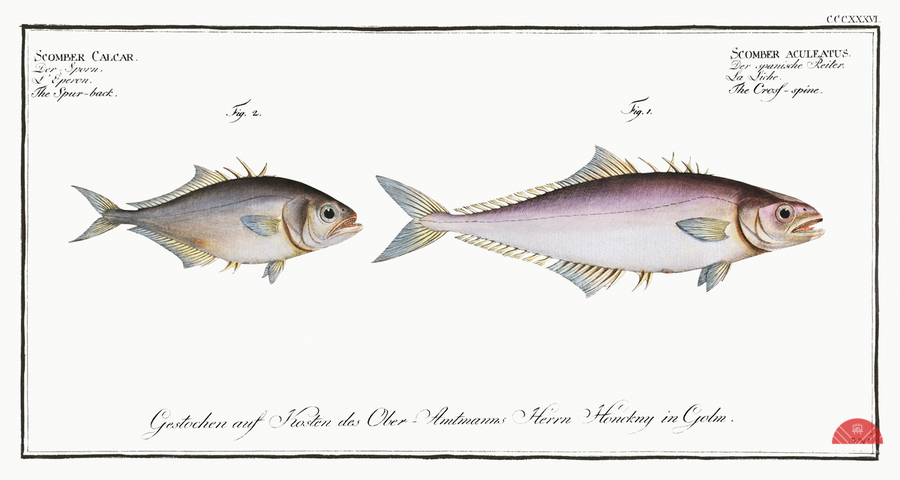 ABOUT THIS ARTWORK: 1. CROSS-SPINE SCOMBER ACULEATUS 2. SPUR-BACK SCOMBER CALCAR