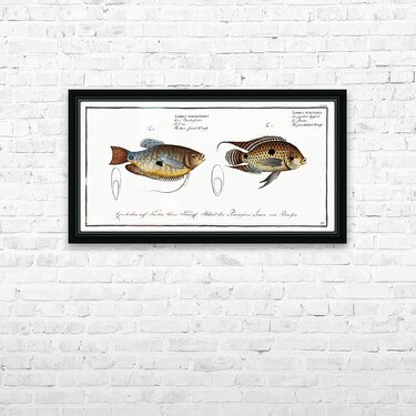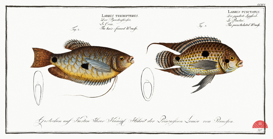 1. Punctulated Wrasse Labrus punctatus 2. Hair-finned Wrasse Labrus trichonterus from Ichtylogie ou Histoire naturelle: génerale et particuliére des poissons 1785-1797 by Marcus Eliser 1723-1799