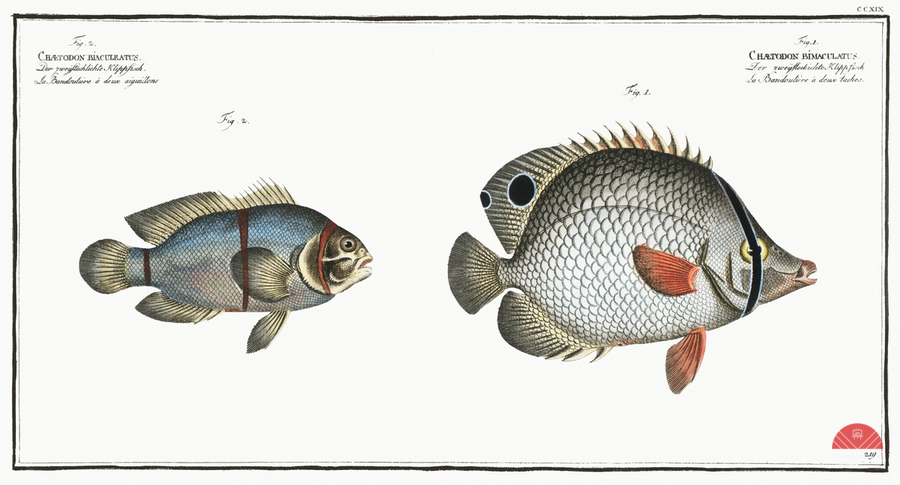 1. Chaetodon bimaculatus 2. Chaetodon biaculeatus from Ichtylogie ou Histoire naturelle: génerale et particuliére des poissons 1785-1797 by Marcus E...[+]