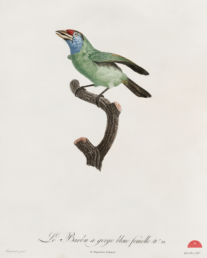 Blue-throated Bearded bee-eater from Histoire Naturelle des Oiseaux de Paradis et Des Rolliers 1806 by Jacques Barraband 1767-1809.