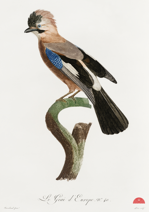 Eurasian Jay from Histoire Naturelle des Oiseaux de Paradis et Des Rolliers 1806 by Jacques Barraband 1767-1809.