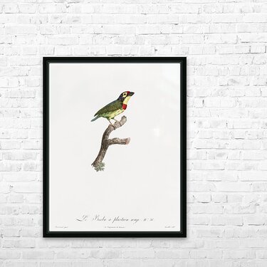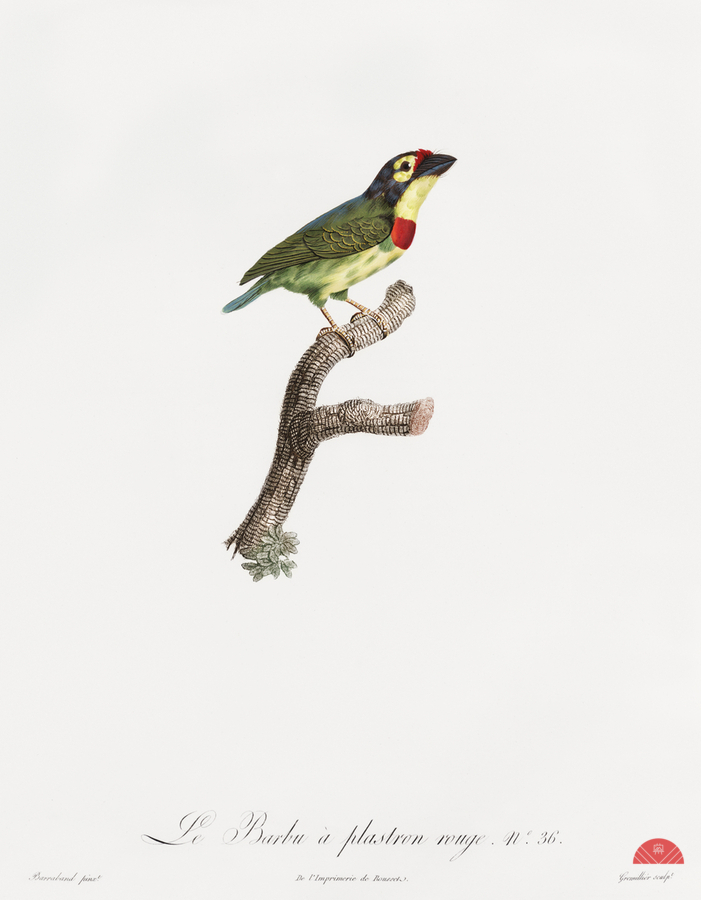Coppersmith barbet from Histoire Naturelle des Oiseaux de Paradis et Des Rolliers 1806 by Jacques Barraband 1767-1809.