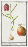 Snake & #39s head fritillary Fritillaria meleagris and an apple 1596–1610 by Anselmus Boëtius de Boodt.