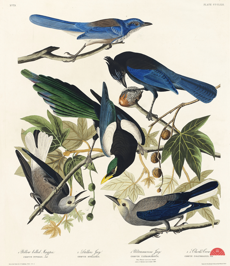 ABOUT THIS ARTWORK: YELLOW-BILLED MAGPIE STELLERS JAY ULTRAMARINE JAY AND CLARKS CROW