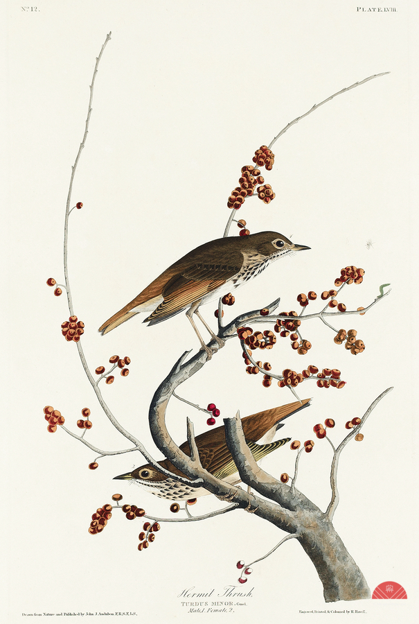 Hermit Thrush from Birds of America 1827 by John James Audubon 1785 - 1851 etched by Robert Havell 1793 - 1878.