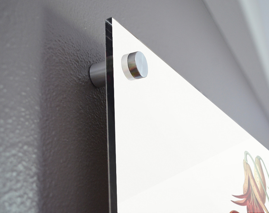 Printed to the edge - Ready to hang - provided with 4 premium polished aluminum stand off ( wall screws and mounting hardware provided ) We suggest a thicker 3/16" acrylic for any size over 42 inches to guarantee a straight acrylic, without curvature
